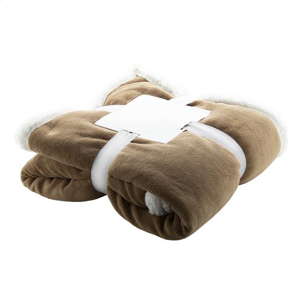 Dwuwarstwowy koc z 200 g/m2 polarem coral fleece i podszewką 210 g/m2 z polaru sherpa. Owinięty wstążką i kartą do nadruku.