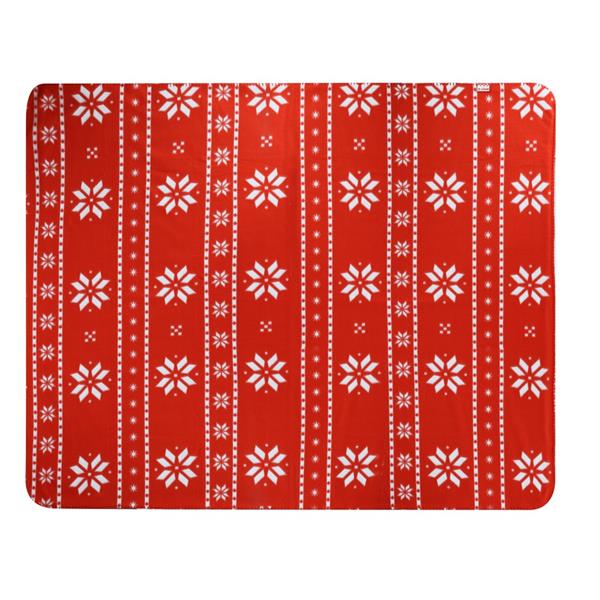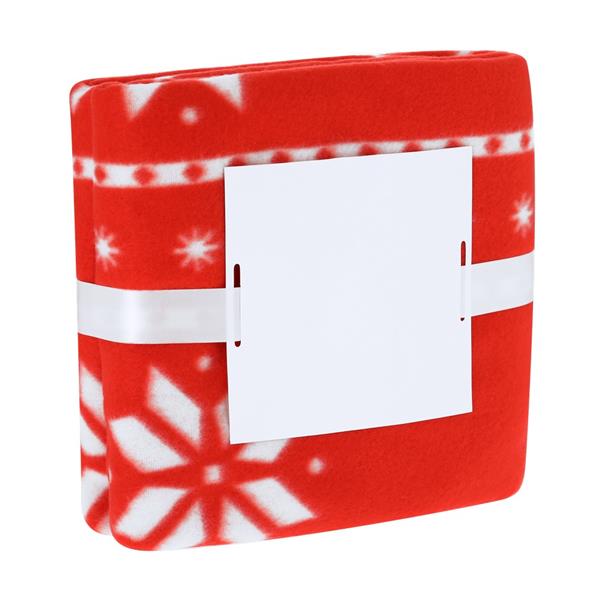 Koc ze świątecznym wzorem, posiada specjalną etykietę do znakowania oraz ozdobną wstążkę, materiał zapobiegający mechaceniu, produkt wykonany z poliestru RPET 200 g/m2