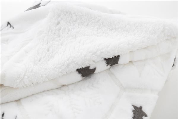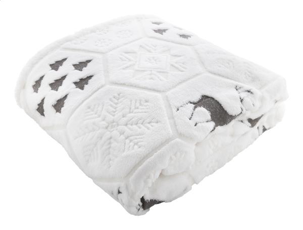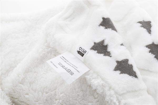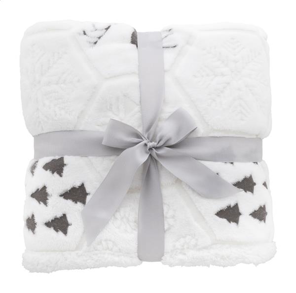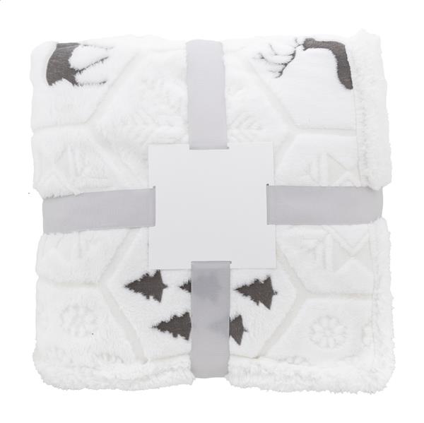 Luksusowy, dwuwarstwowy koc świąteczny z RPET z wytłoczonym wzorem o zimowej tematyce. Z flanelowym polarem RPET o gramaturze 270 g/m2 i dwustronną podszewką z polaru sherpa RPET o gramaturze 210 g/m2. Zapakowany w wstążkę i kartonik do zadruku.