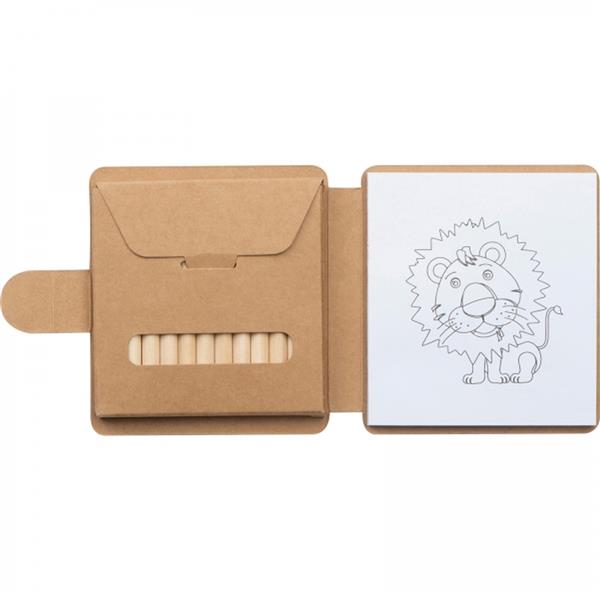 Kolorowanka w formie książeczki, z zestawem 12 kolorowych kredek i bloczkiem z 40 kartkami (12 kartek z motywem do kolorowania i 28 czystych kartek).