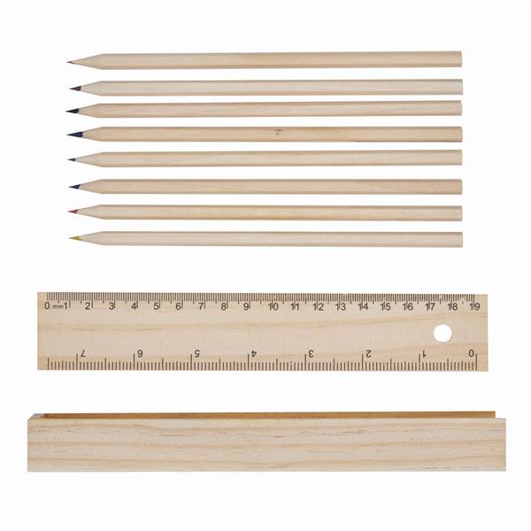 Komplet 8 kredek STRAIGHT zapakowanych w drewniane pudełko z linijką, naostrzone. Materiał: Drewno Kolor: drewniany Tagi: Kredki,długopisy,przybory do rysowania,linijki