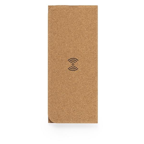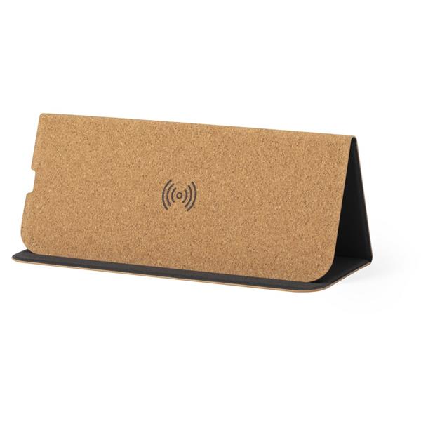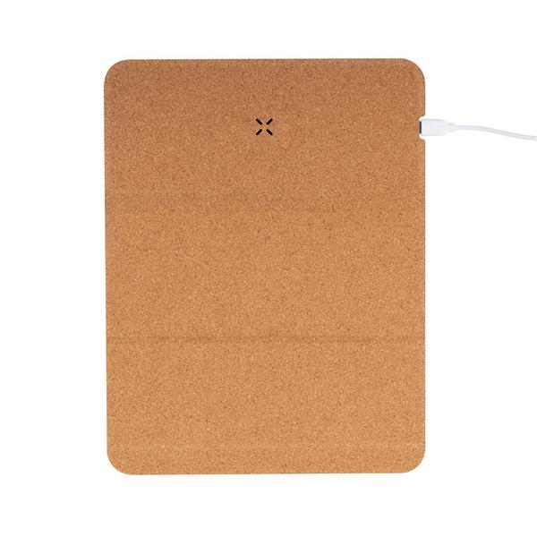 Korkowa podkładka pod mysz, bezprzewodowa ładowarka 5W, działa z urządzeniami posiadającymi możliwość ładowania indukcyjnego, może pełnić funkcję stojaka na telefon, antypoślizgowy spód, wejście USB-C 5V/1A, kabel USB-C w komplecie
