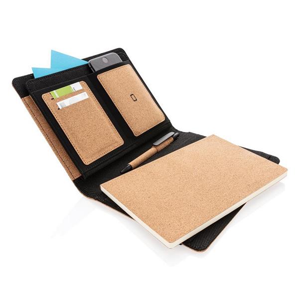 Korkowa teczka konferencyjna A5 z notatnikiem (64 kartki 80 g/m2 w linie), wewnątrz duża kieszeń, kieszeń na telefon, 2 miejsca na karty kredytowe i 2 pętle na akcesoria do pisania, długopis wykonany z korka i słomy pszenicznej w komplecie, w ozdobnym, kraftowym pudełku, ślad węglowy produktu: 1,43 kg CO2