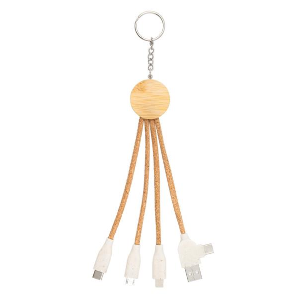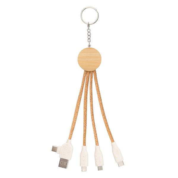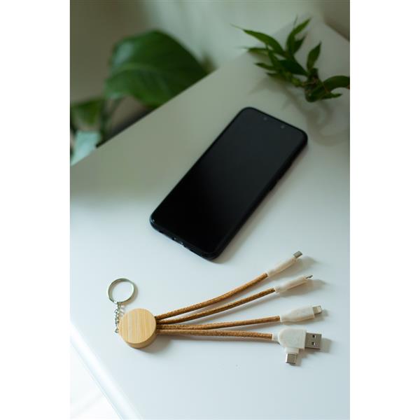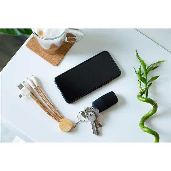 Brelok do kluczy, korkowy kabel do ładowania B’RIGHT, elementy z bambusa i włókien słomy pszenicznej, 17 cm, 5 końcówek: USB, 2x USB-C, micro USB oraz kompatybilna z urządzeniami iOS, moc maksymalna ładowania USB C do USB C 10W, USB C do iOS 10W, USB do micro USB 10W