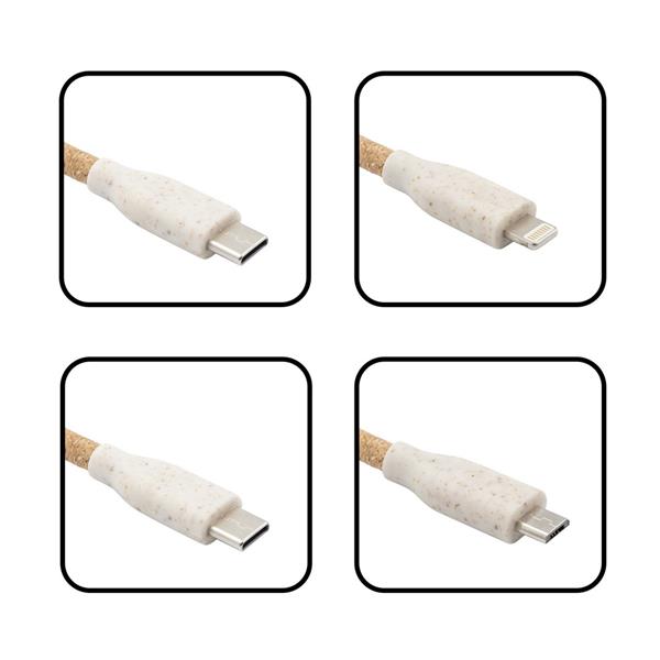 Korkowy kabel do ładowania BRIGHT, elementy z włókien słomy pszenicznej, długość 120 cm, 4 końcówki: 2x USB-C, micro USB oraz kompatybilna z urządzeniami iOS, moc maksymalna ładowania USB C do USB C 60W, pozostałe złącza 12W, końcówka USB-C z funkcją synchronizacji
