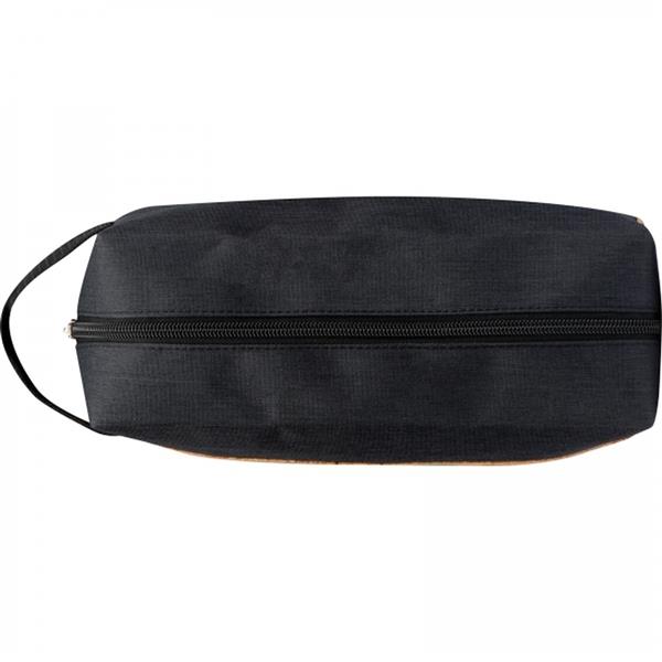 Kosmetyczka wykonana z poliestru z korkowym dnem. Kosmetyczka zamykana na zamek, wyposażona w wygodną rączkę ułatwiającą transport.