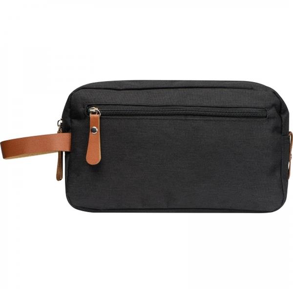 Kosmetyczka wykonana z poliestru 300D z uchwytem z PU. Kosmetyczka posiada dwie duże przegródki zamykane na zamek oraz mniejszą, frontową kieszeń.