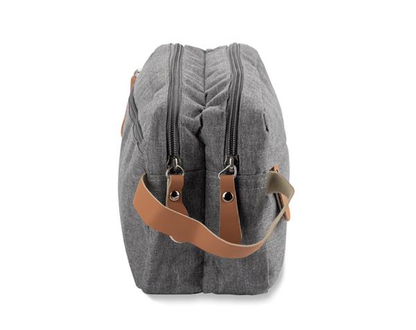 Zakończenia suwaków i uchwyt z brązowej, ekologicznej skóry nadają jej elegancki wygląd i dodają wyjątkowego charakteru.
