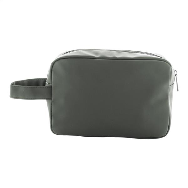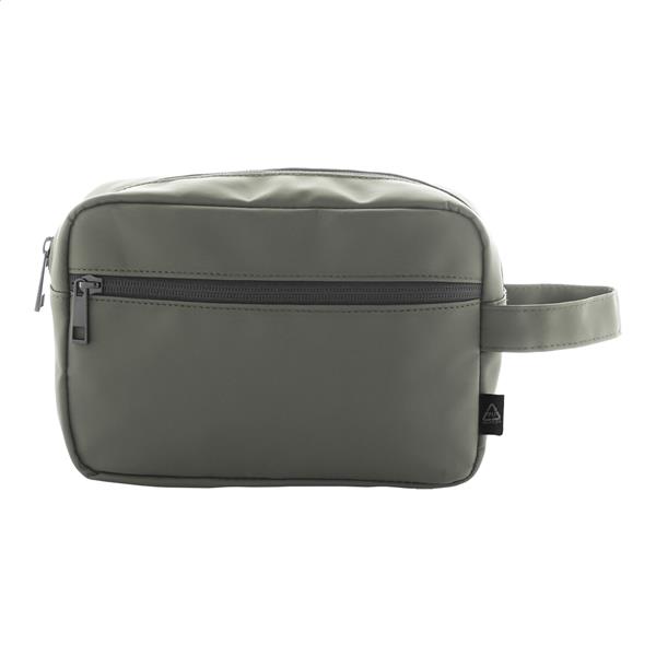 Miękka kosmetyczka z recyklingowanej skóry PU z dwoma przegrodami na suwak i uchwytem do przenoszenia. Z charakterystyczną metką z recyklingowanego PU.