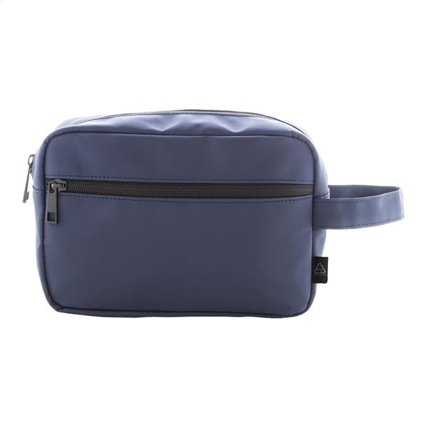 Miękka kosmetyczka z recyklingowanej skóry PU z dwoma przegrodami na suwak i uchwytem do przenoszenia. Z charakterystyczną metką z recyklingowanego PU.