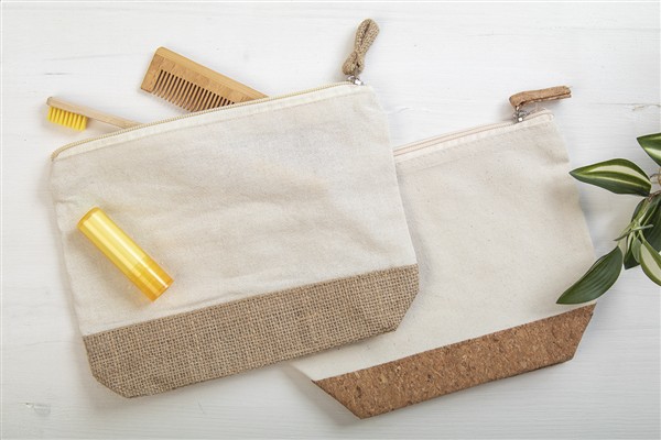 Zapinana na zamek kosmetyczka z bawełny i laminowanej juty.