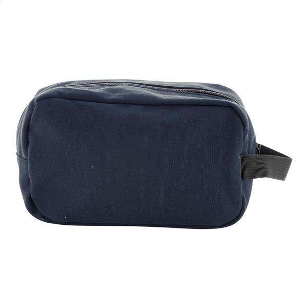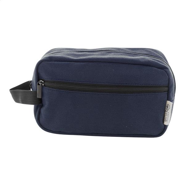 Kosmetyczka z płótna z recyklingu z dwoma przegrodami na suwak i uchwytem do przenoszenia. 70% bawełny z recyklingu i 30% poliestru RPET. Z charakterystyczną metką z bawełny z recyklingu.