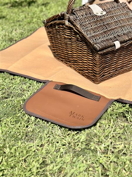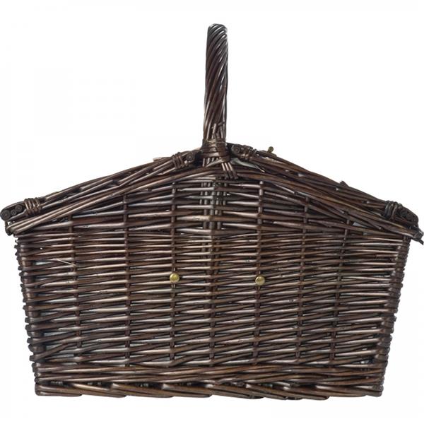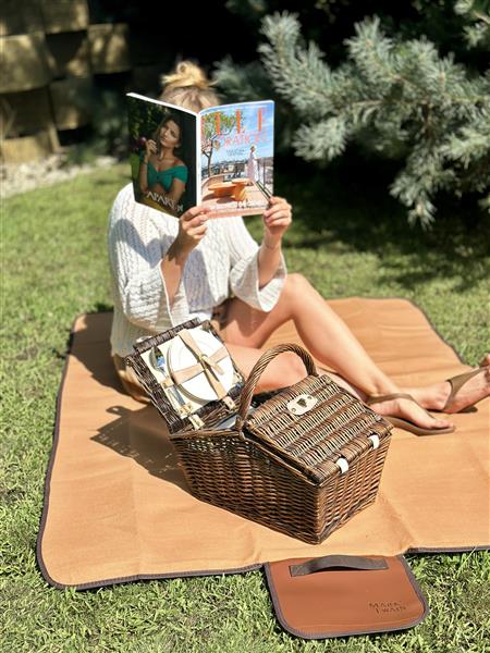 Koszyk piknikowy dla dwóch osób, zaopatrzony w plastikowe kieliszki, porcelanowe talerze, sztućce oraz nóż kelnerski, a także komorę chłodzącą.