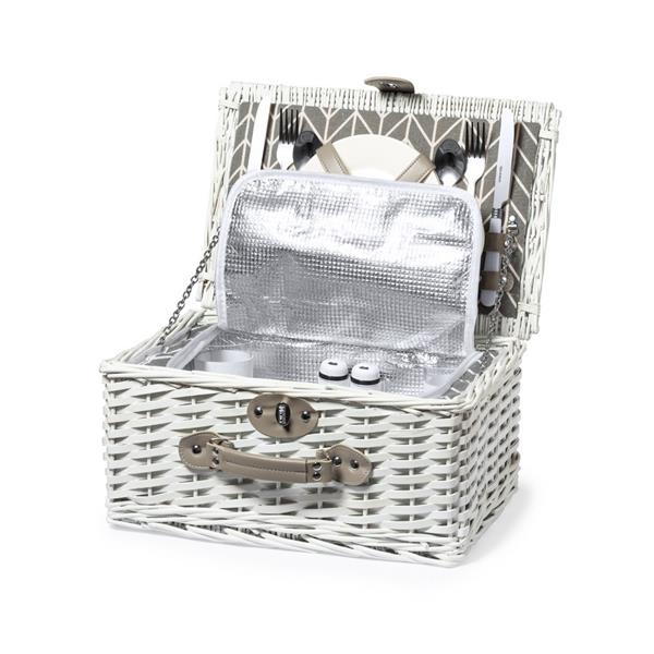Kosz piknikowy, termoizolacyjny z nakryciem dla 2 osób, 12 elementów, zawiera: sztućce ze stali nierdzewnej z plastikowymi uchwytami, 2 talerze, 2 szklanki wykonane z PS, 2 solniczki