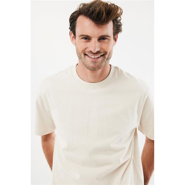 Koszulka, unisex, nowoczesny krój, okrągły dekolt, krótkie rękawy, wykonana w 50% z bawełny z recyklingu i w 50% z bawełny organicznej o gramaturze 220 g/m2, bez dodatku poliestru, posiada wbudowany znacznik AWARE™, który potwierdza wykorzystanie materiałów z recyklingu, posiada kod QR na metce, który prowadzi do cyfrowego paszportu produktu, 2% wpływów z każdego sprzedanego produktu jest przekazywane na rzecz Water.org