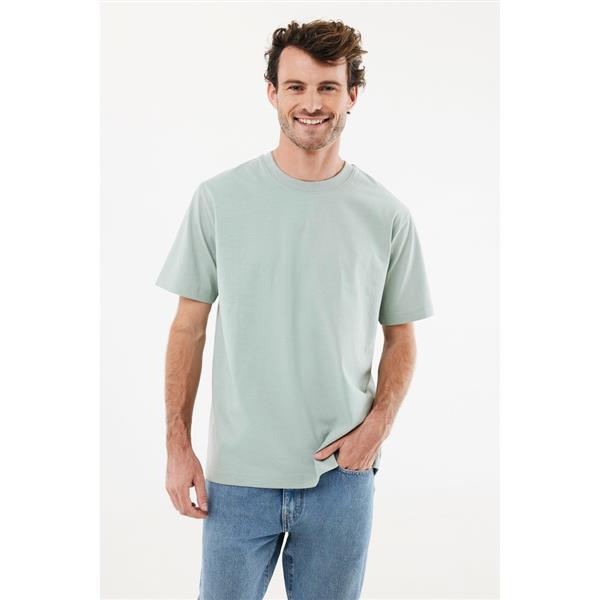 Koszulka, unisex, nowoczesny krój, okrągły dekolt, krótkie rękawy, wykonana w 50% z bawełny z recyklingu i w 50% z bawełny organicznej o gramaturze 220 g/m2, bez dodatku poliestru, posiada wbudowany znacznik AWARE™, który potwierdza wykorzystanie materiałów z recyklingu, posiada kod QR na metce, który prowadzi do cyfrowego paszportu produktu, 2% wpływów z każdego sprzedanego produktu jest przekazywane na rzecz Water.org