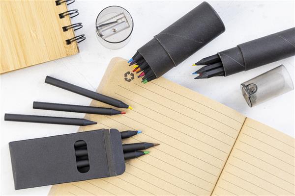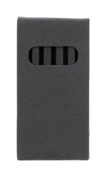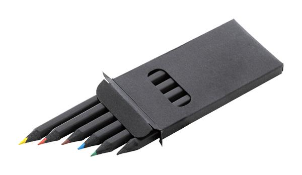 Zestaw 6 czarnych drewnianych kredek w czarnym pudełku z papieru pochodzącego z recyklingu.