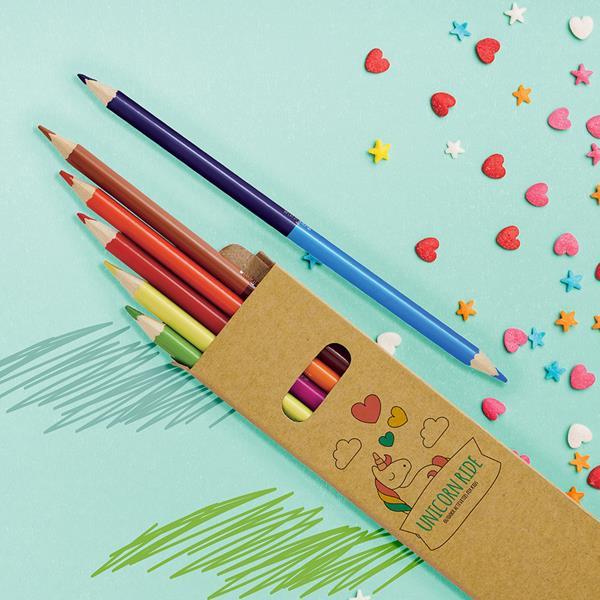 Zestaw 6 dwukolorowych kredek w tekturowym kartoniku.