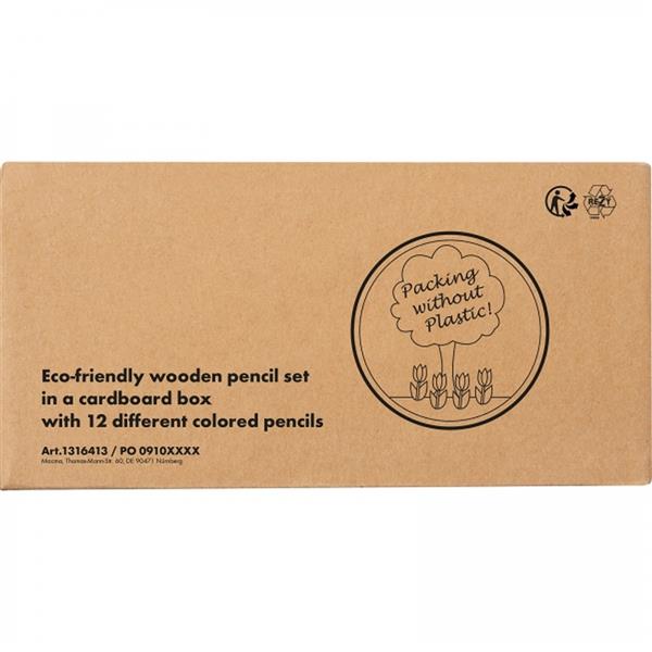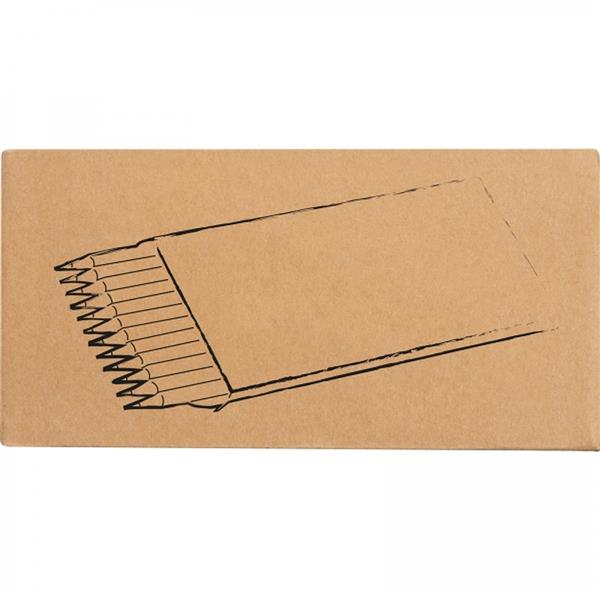 Zestaw drewnianych kredek w 12 różnych kolorach. Kredki pakowane w tekturowe pudełko.