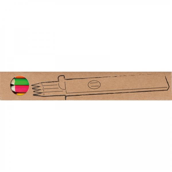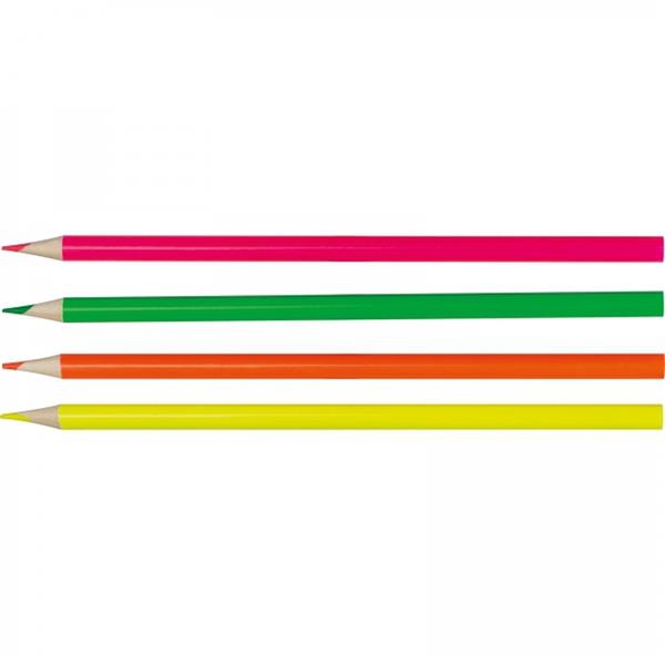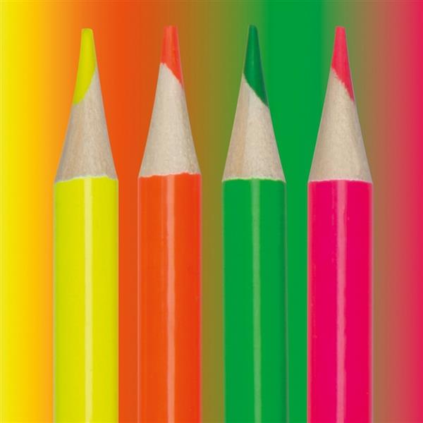 Zestaw 4 kredek w neonowych kolorach (pomarańczowy, zielony, różowy i żółty). Kredki mogą stanowić ekologiczną alternatywę dla zakreślaczy.