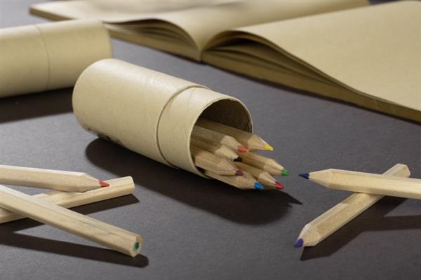 Zestaw REDKO to 12 drewnianych kredek zapakowanych w tekturową tubę.