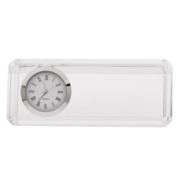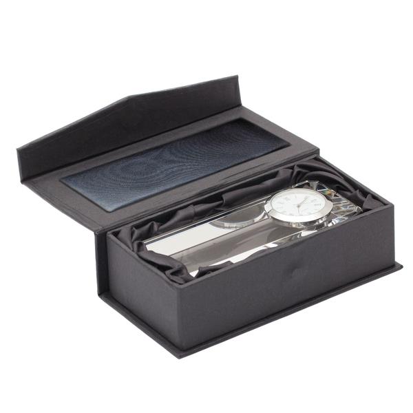 Kryształowy przycisk do papieru z zegarem. Pakowany w czarne upominkowe pudełko. W zestawie bateria AG4 1szt.
