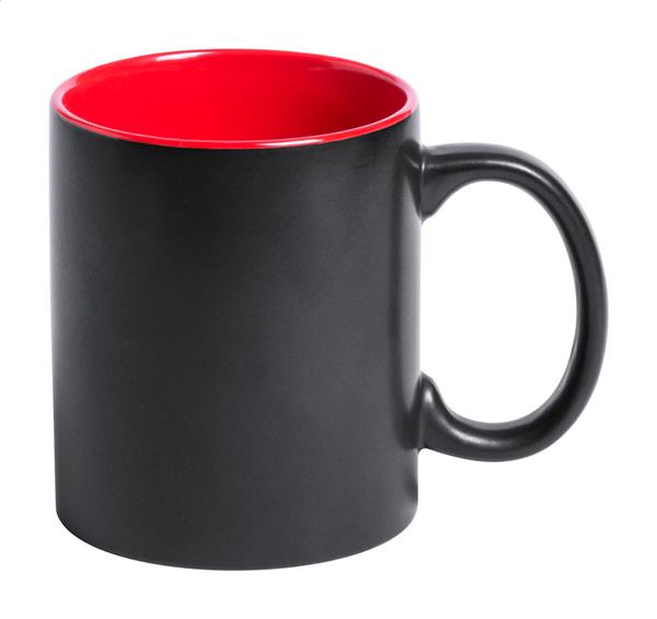 Czarny kubek ceramiczny z kolorowym środkiem. Pokryty specjalną powłoką do grawerowania, wygrawerowane logo będzie miało ten sam kolor co środek. W pudełku. Poj. 350 ml.