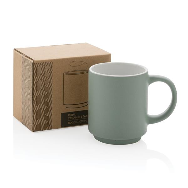 Kubek ceramiczny 180 ml, specjalna konstrukcja umożliwia przechowywanie kubków jeden na drugim co pozwala na oszczędność miejsca, można myć w zmywarce, w pudełku z papieru kraftowego, ślad węglowy produktu: 0,96 kg CO2
