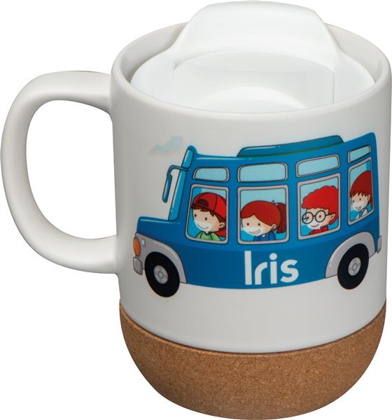 Kubek ceramiczny, o pojemności 300 ml z pokrywą i korkową podstawką. Kubek nadaje się do sublimacji, można go myć w zmywarce po zdjęciu korkowego elementu.