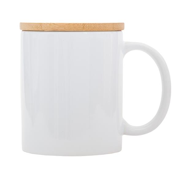 Ceramiczny kubek z bambusową pokrywką. Pojemność 330 ml.