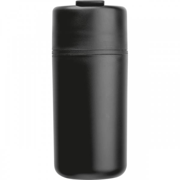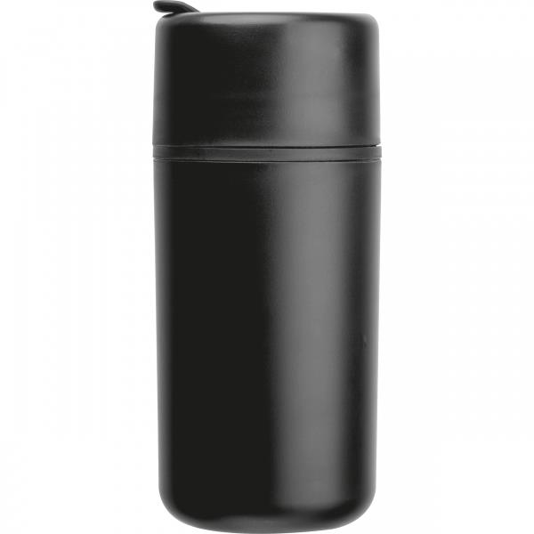 Kubek do picia z podwójnymi ściankami wykonany z polipropylenu o pojemności 500 ml z przesuwną pokrywką do picia. Nadaje się do napojów gazowanych.