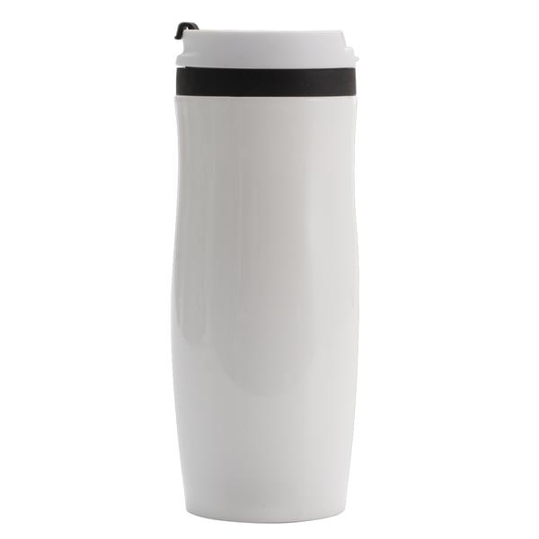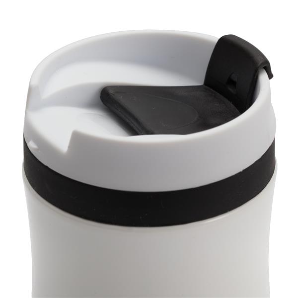 Kubek termiczny – o pojemności 390 ml z dwiema ściankami ze stali nierdzewnej, zewnętrzna pokryta lakierem. Wewnętrzna ścianka wykonana ze stali o podwyższonej jakości 18/8. Podstawa kubka z wodoodpornej gumy termoplastycznej TPR. Zamknięcie typu flip up sip. Utrzymuje ciepło do 7 godzin.