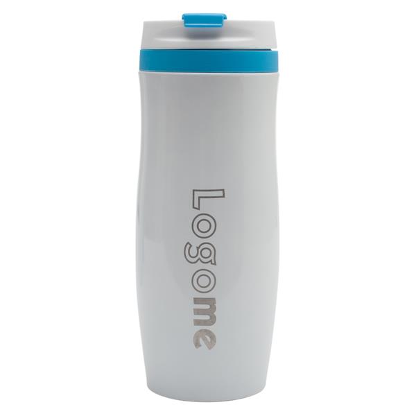 Kubek termiczny – o pojemności 390 ml z dwiema ściankami ze stali nierdzewnej, zewnętrzna pokryta lakierem. Wewnętrzna ścianka wykonana ze stali o podwyższonej jakości 18/8. Podstawa kubka z wodoodpornej gumy termoplastycznej TPR. Zamknięcie typu flip up sip. Utrzymuje ciepło do 7 godzin.