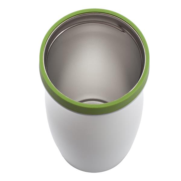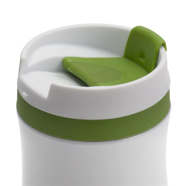 Kubek termiczny – o pojemności 390 ml z dwiema ściankami ze stali nierdzewnej, zewnętrzna pokryta lakierem. Wewnętrzna ścianka wykonana ze stali o podwyższonej jakości 18/8. Podstawa kubka z wodoodpornej gumy termoplastycznej TPR. Zamknięcie typu flip up sip. Utrzymuje ciepło do 7 godzin.
