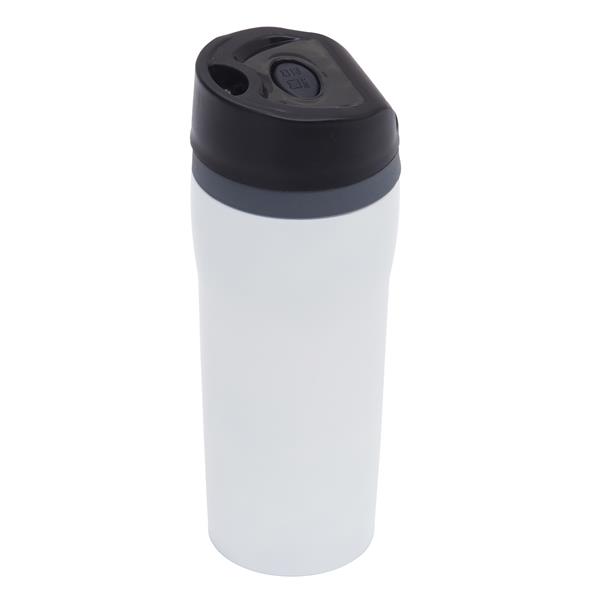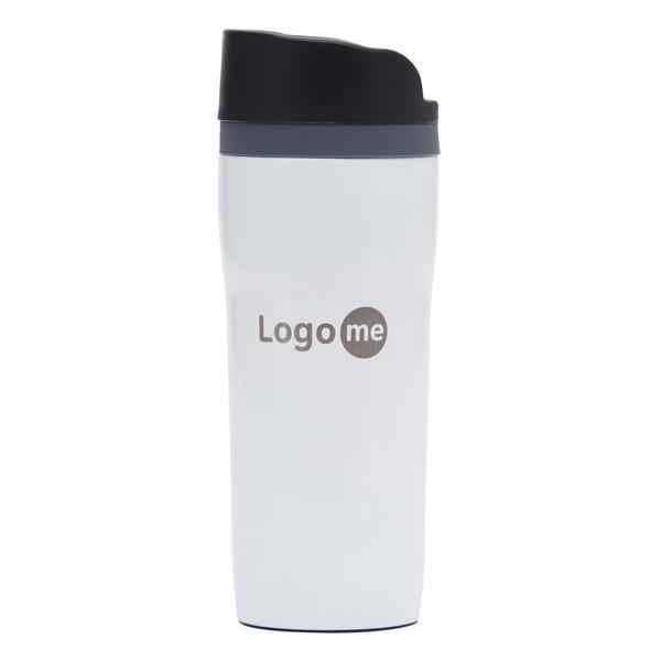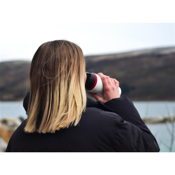 Szczelny kubek termiczny – termos o pojemności 350 ml. Dwie ścianki ze stali nierdzewnej, wewnątrz stal 18/8 o podwyższonej jakości. Rozkręcana pokrywka umożliwiająca jej dokładne umycie. Szczelne zamknięcie – leak proof zapobiega wyciekaniu płynów. Próżnia między ściankami kubka zapewnia parametry termosu. Zamknięcie typu open/close. Podstawa kubka z wodoodpornej gumy termoplastycznej TPR. Utrzymuje ciepło do 12 godzin. Możliwość dobrania dodatkowej opaski R00001.