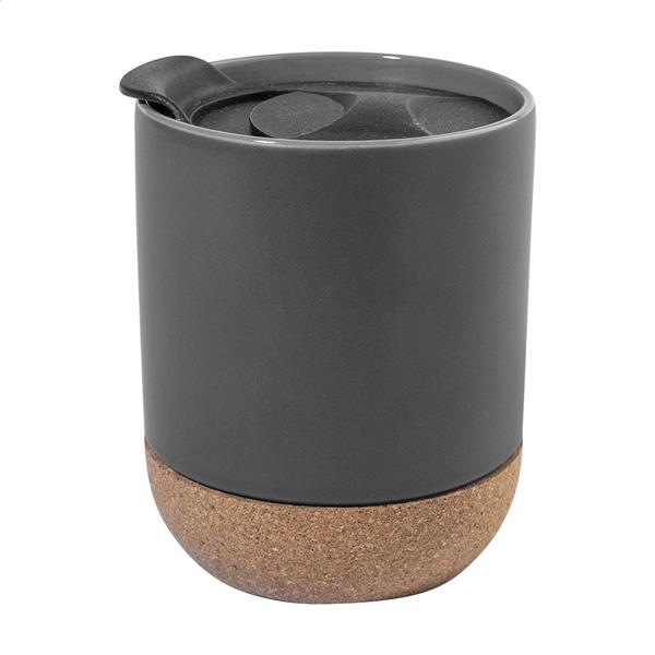 Wysokiej jakości kubek ceramiczny z podstawą z naturalnego korka i pokrywką z tworzywa PP. Z matowym wykończeniem na zewnątrz i błyszczącym wykończeniem wewnątrz. 325ml. W pudełku z papieru kraft.