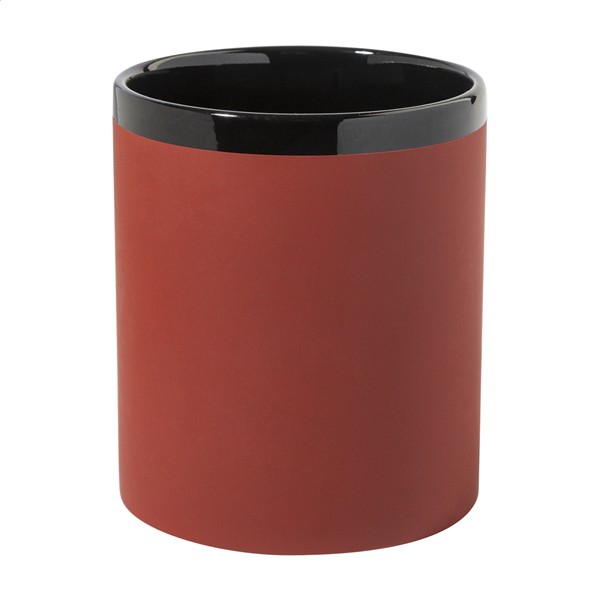 Kubek ceramiczny z miękkim w dotyku, gumowanym wykończeniem, z czarnym wnętrzem i rantem, 300 ml. Specjalna powłoka do grawerowania, grawerowane logo w kolorze dopasowanym do wnętrza. W pudełku z papieru kraft.