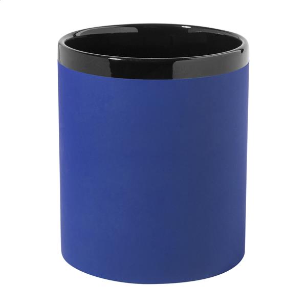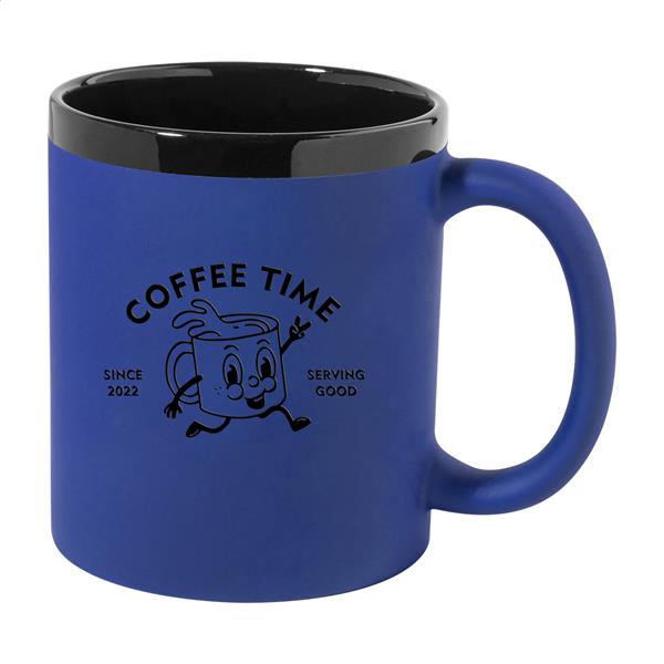 Kubek ceramiczny z miękkim w dotyku, gumowanym wykończeniem, z czarnym wnętrzem i rantem, 300 ml. Specjalna powłoka do grawerowania, grawerowane logo w kolorze dopasowanym do wnętrza. W pudełku z papieru kraft.