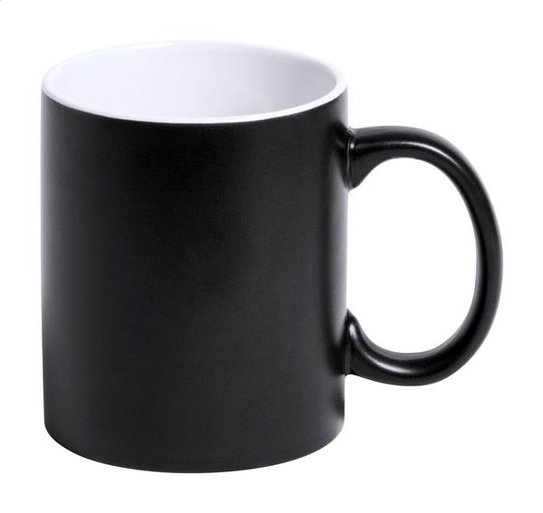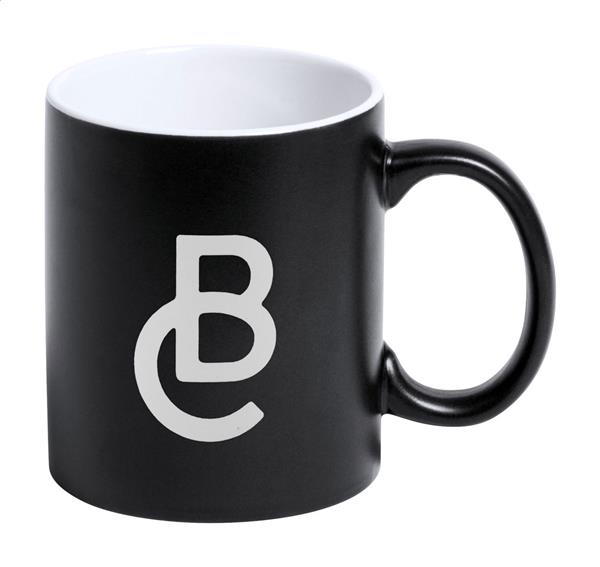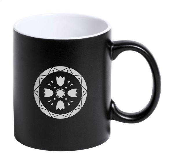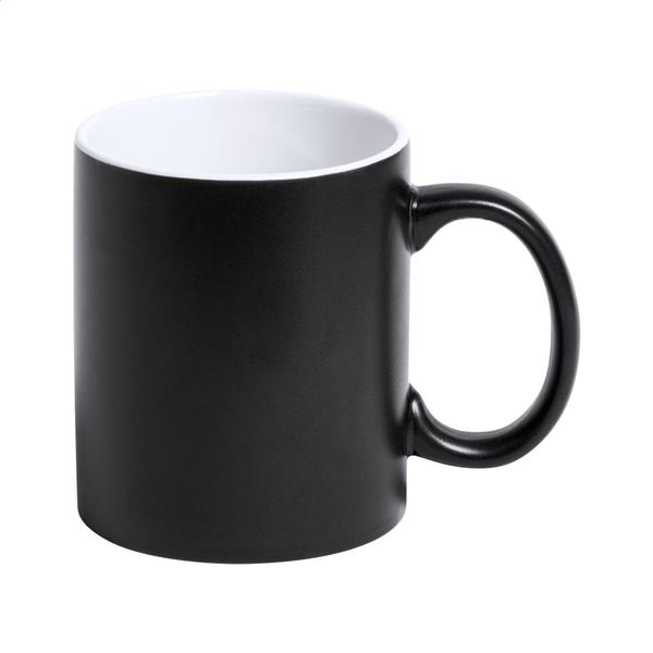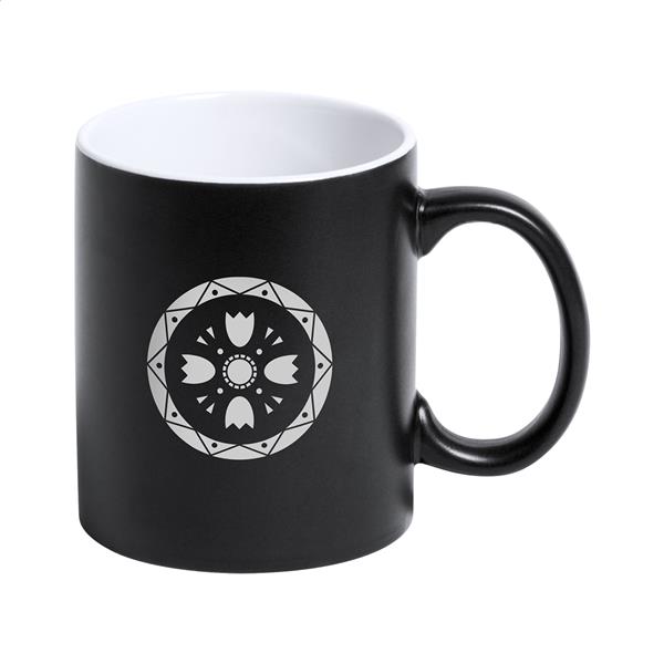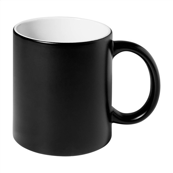 Kolorowy kubek ceramiczny z białym środkiem. Pokryty specjalną powłoką do grawerowania, wygrawerowane logo będzie miało ten sam kolor co środek. W pudełku. Poj. 350 ml.