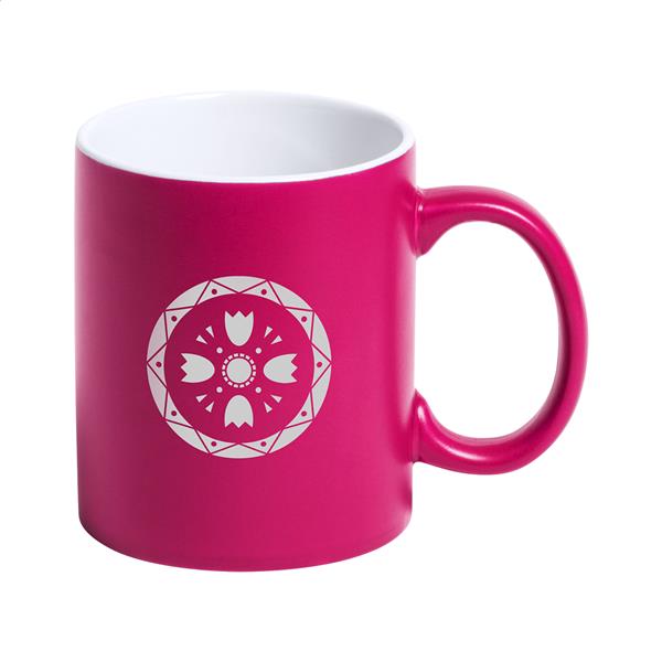 Kolorowy kubek ceramiczny z białym środkiem. Pokryty specjalną powłoką do grawerowania, wygrawerowane logo będzie miało ten sam kolor co środek. W pudełku. Poj. 350 ml.