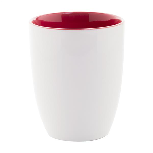 Wysokiej jakości biały kubek ceramiczny z kolorowym wnętrzem, pojemność 340 ml. W pudełku z papieru kraft.