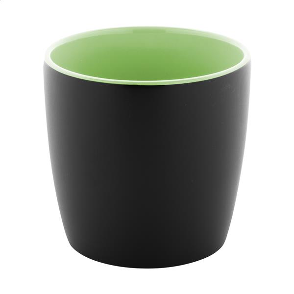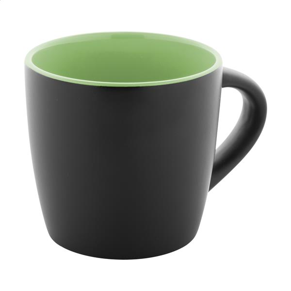 Kubek ceramiczny wysokiej jakości z matowym czarnym wykończeniem na zewnątrz i błyszczącym kolorowym wykończeniem wewnątrz, 300 ml. W pudełku z papieru kraft.