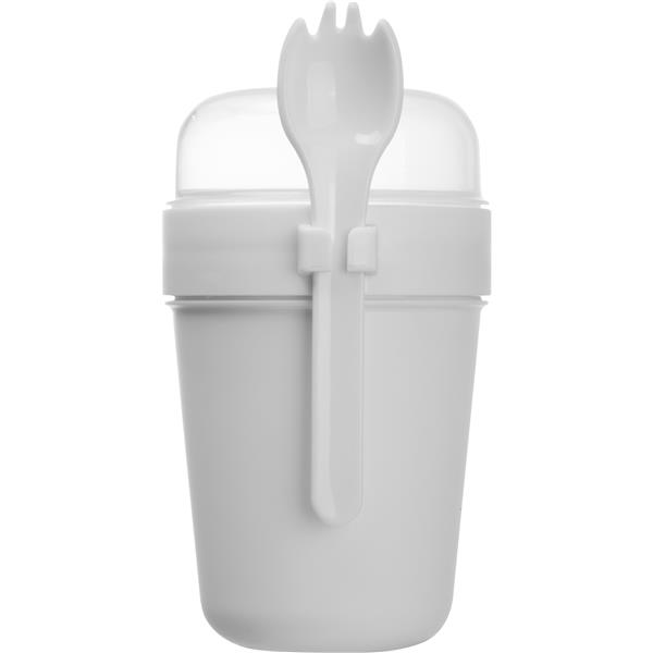 Kubek na jogurt (500 ml) z osobnym pojemniczkiem na muesli w wieczku (250 ml) i łyżkowidelcem mocowanym z boku kubka.