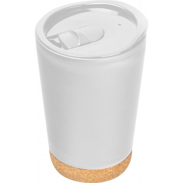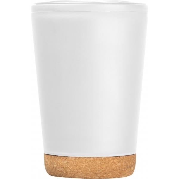 Plastikowy kubek z korkowym dnem i silikonowym wieczkiem. Pojemność 280 ml.