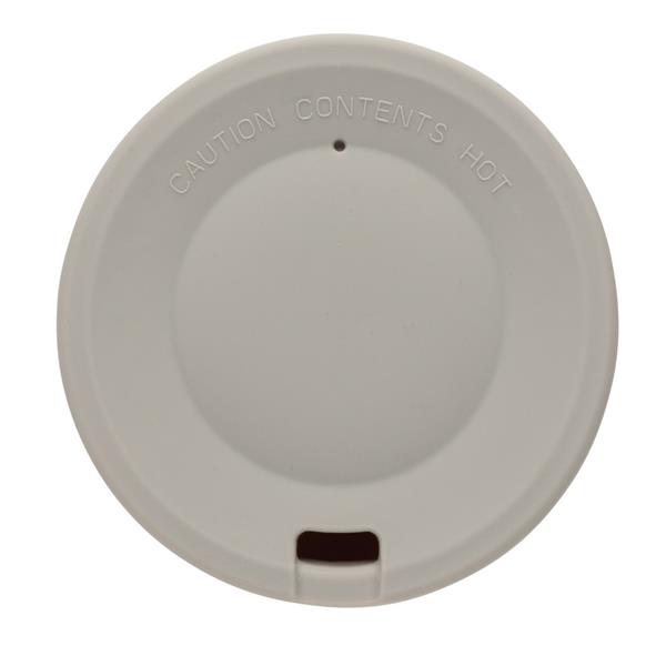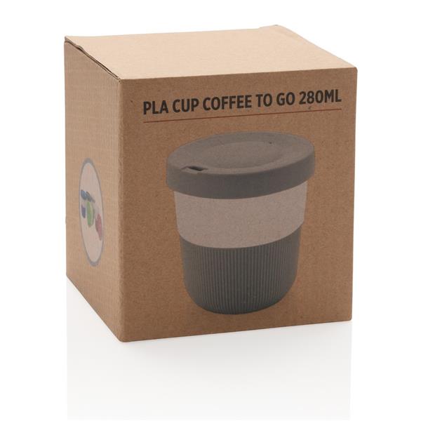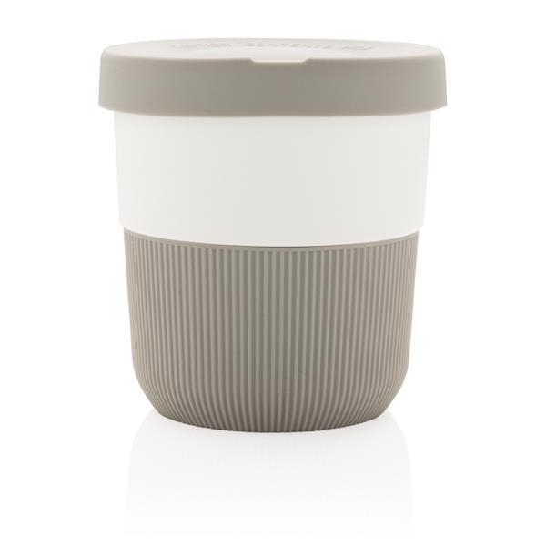 Kubek podróżny 250 ml, wykonany z PLA, silikonowe wieczko i uchwyt, pasuje do większości ekspresów do kawy, nie zawiera melaminy, ślad węglowy produktu: 0,63 kg CO2