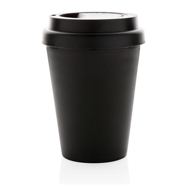 Kubek termiczny 300 ml, lekki, trwały i wielokrotnego użytku, wykonany z materiału PP w 100% nadającego się do recyklingu, podwójne ścianki, zakręcane wieczko, odporny na temperaturę do 100 stopni Celsjusza, wyłącznie mycie ręczne, ślad węglowy produktu: 0,36 kg CO2