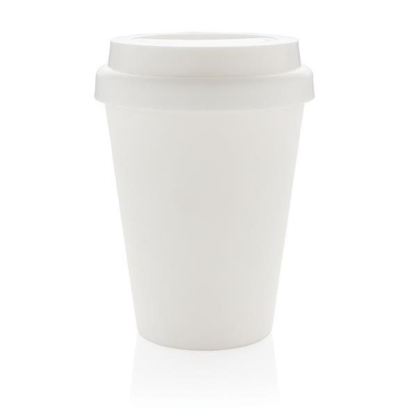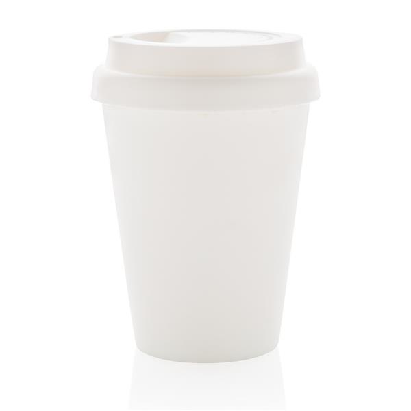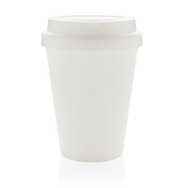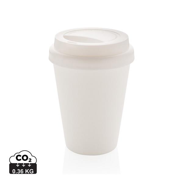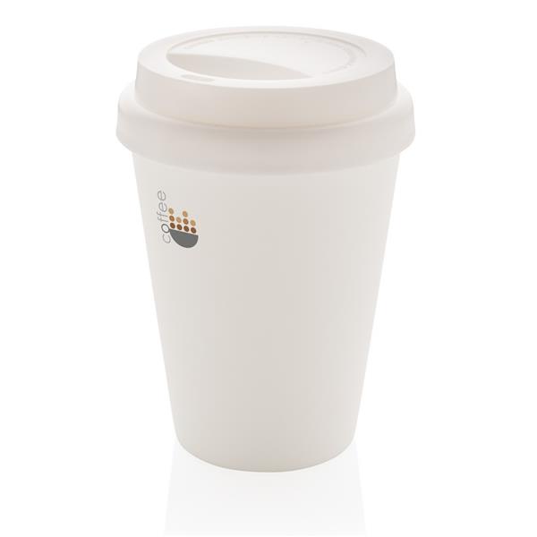 Kubek termiczny 300 ml, lekki, trwały i wielokrotnego użytku, wykonany z materiału PP w 100% nadającego się do recyklingu, podwójne ścianki, zakręcane wieczko, odporny na temperaturę do 100 stopni Celsjusza, wyłącznie mycie ręczne, ślad węglowy produktu: 0,36 kg CO2