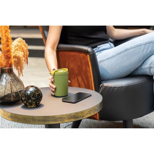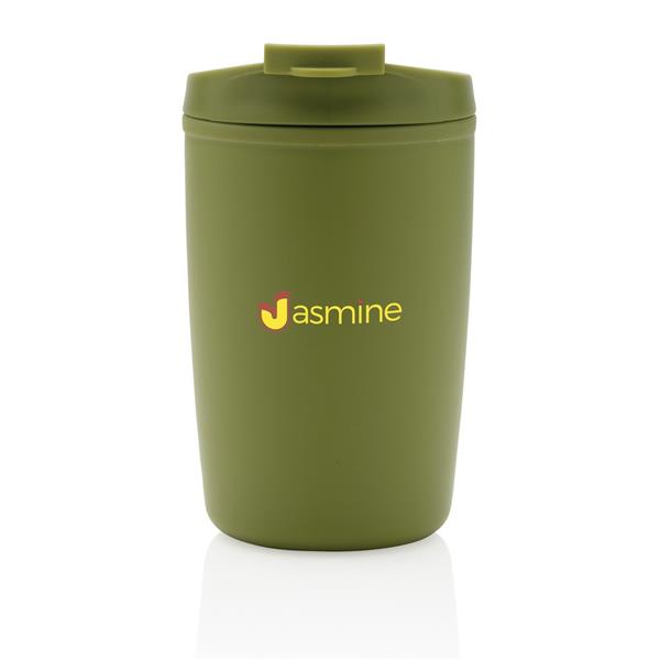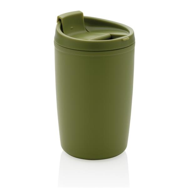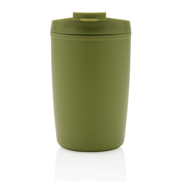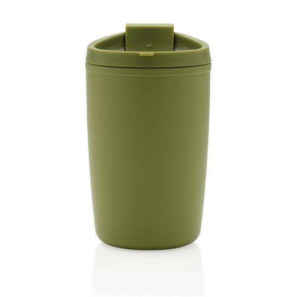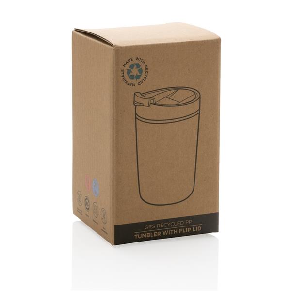 Kubek podróżny 300 ml, nie wymaga obsługi oburącz, wykonany z PP z recyklingu z certyfikatem GRS (Global Recycled Standard) który gwarantuje, że wykorzystane materiały pochodzą z recyklingu, całkowita zawartość materiału z recyklingu obliczona w oparciu o wagę całkowitą przedmiotu: 96%, można myć w zmywarce i używać w kuchence mikrofalowej, w pudełku z papieru kraftowego z certyfikatem FSC® (Forest Stewardship Council)