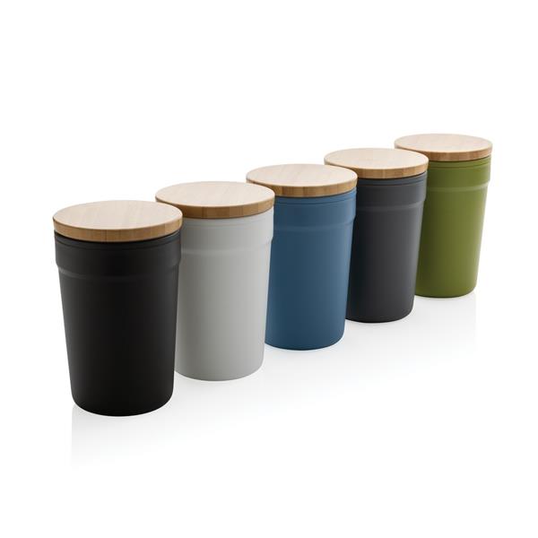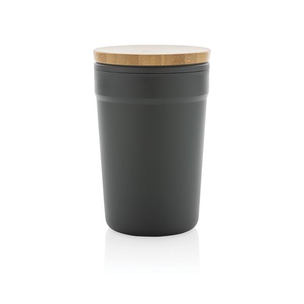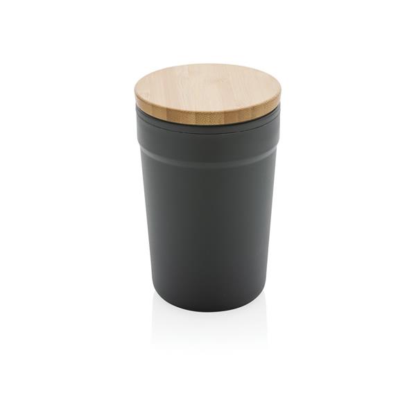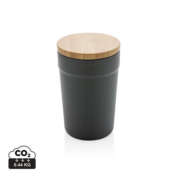 Kubek podróżny 300 ml, bambusowe wieczko, wykonany z PP z recyklingu z certyfikatem GRS, całkowita zawartość materiałów z recyklingu obliczona na podstawie wagi całkowitej przedmiotu: 52%, w ozdobnym pudełku z papieru kraftowego z certyfikatem FSC®, ślad węglowy produktu: 0,39 kg CO2