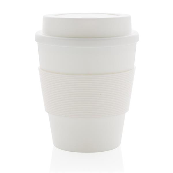 Kubek podróżny 350 ml, lekki, trwały i wielokrotnego użytku, wykonany z nadającego się w 100% do recyklingu materiału PP, silikonowy uchwyt, zakręcane wieczko, odporny na temperaturę do 100 stopni Celsjusza, kubek można myć w zmywarce i używać w kuchence mikrofalowej, ślad węglowy produktu: 0,34 kg CO2